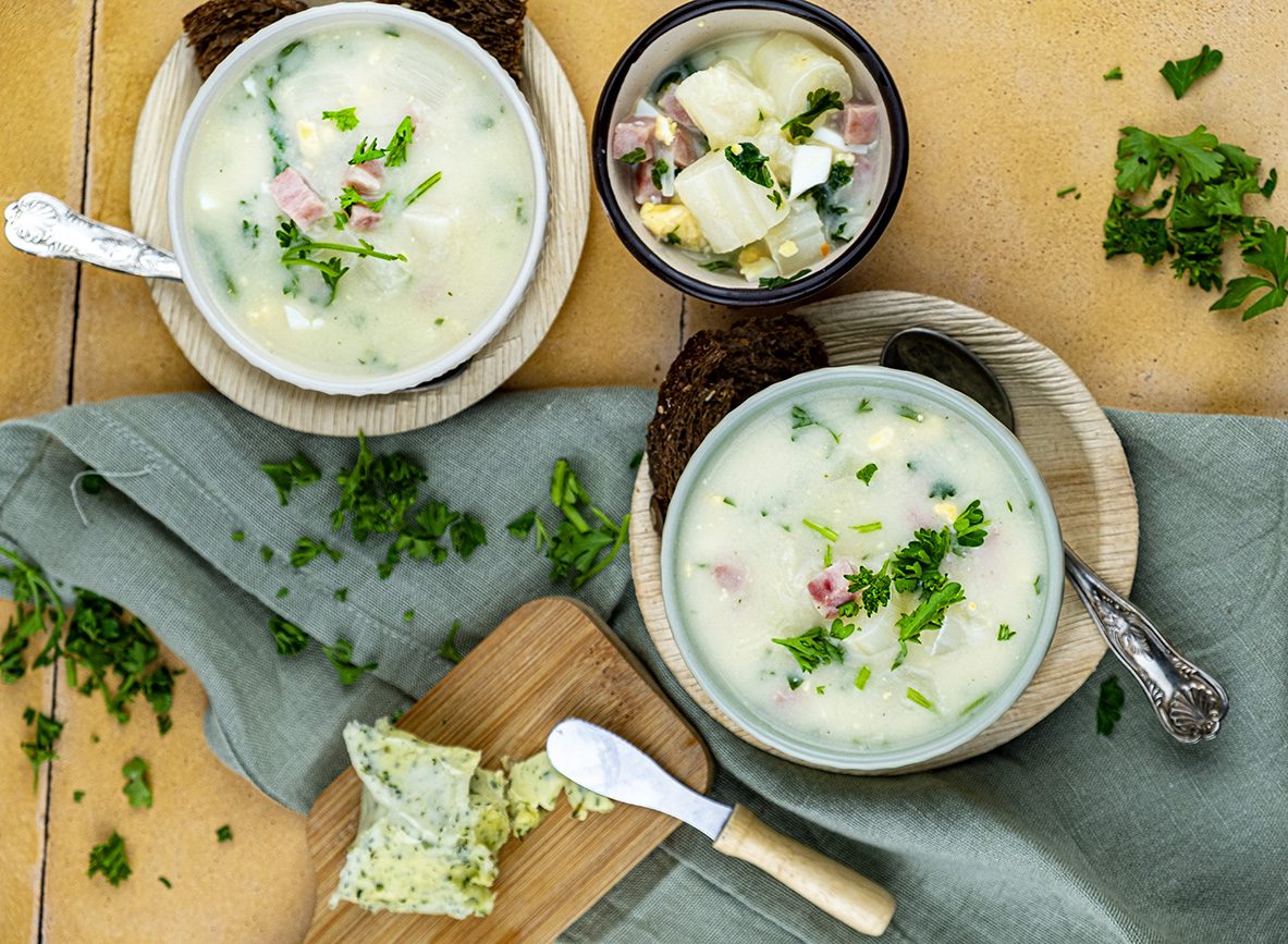 Voeg daarna de ham blokjes, kookroom en het bouillonblokje toe. Breng weer aan de kook en voeg na 5 minuutjes de reepjes ei en de helft van de peterselie toe. Laat dit nog 1 a 2 minuutjes meedoen en voeg eventueel nog wat zout en peper toe.